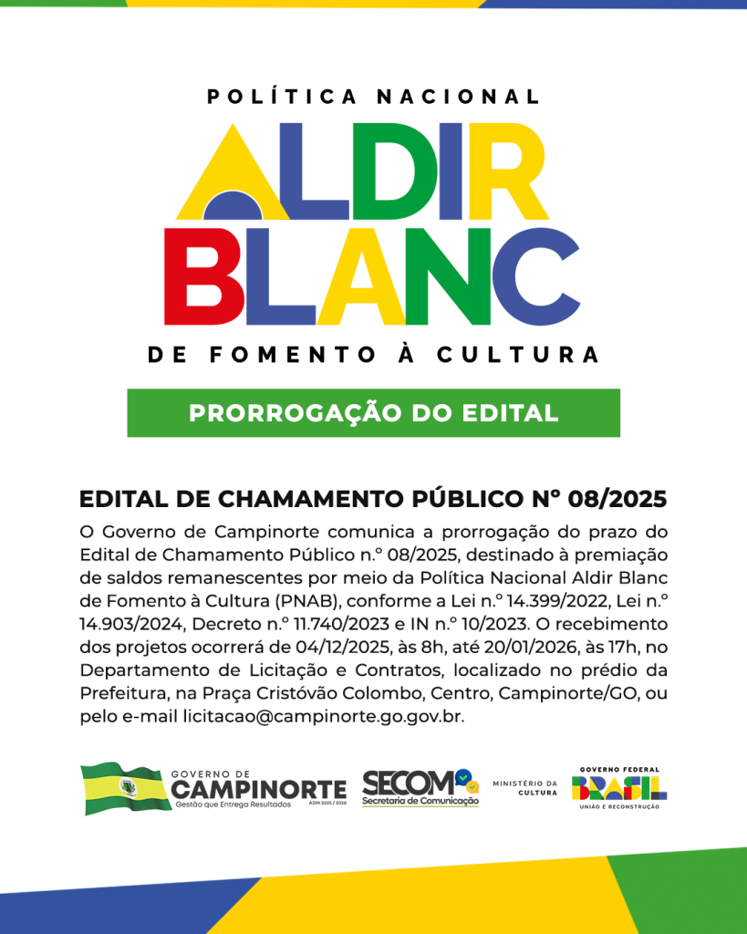 O Governo de Campinorte comunica a prorrogação do prazo do Edital de Chamamento Público n.º 08/2025, destinado à premiação de saldos remanescentes por meio da Política Nacional Aldir Blanc de Fomento à Cultura (PNAB), conforme a Lei n.º 14.399/2022, Lei n.º 14.903/2024, Decreto n.º 11.740/2023 e Instrução Normativa n.º 10/2023.